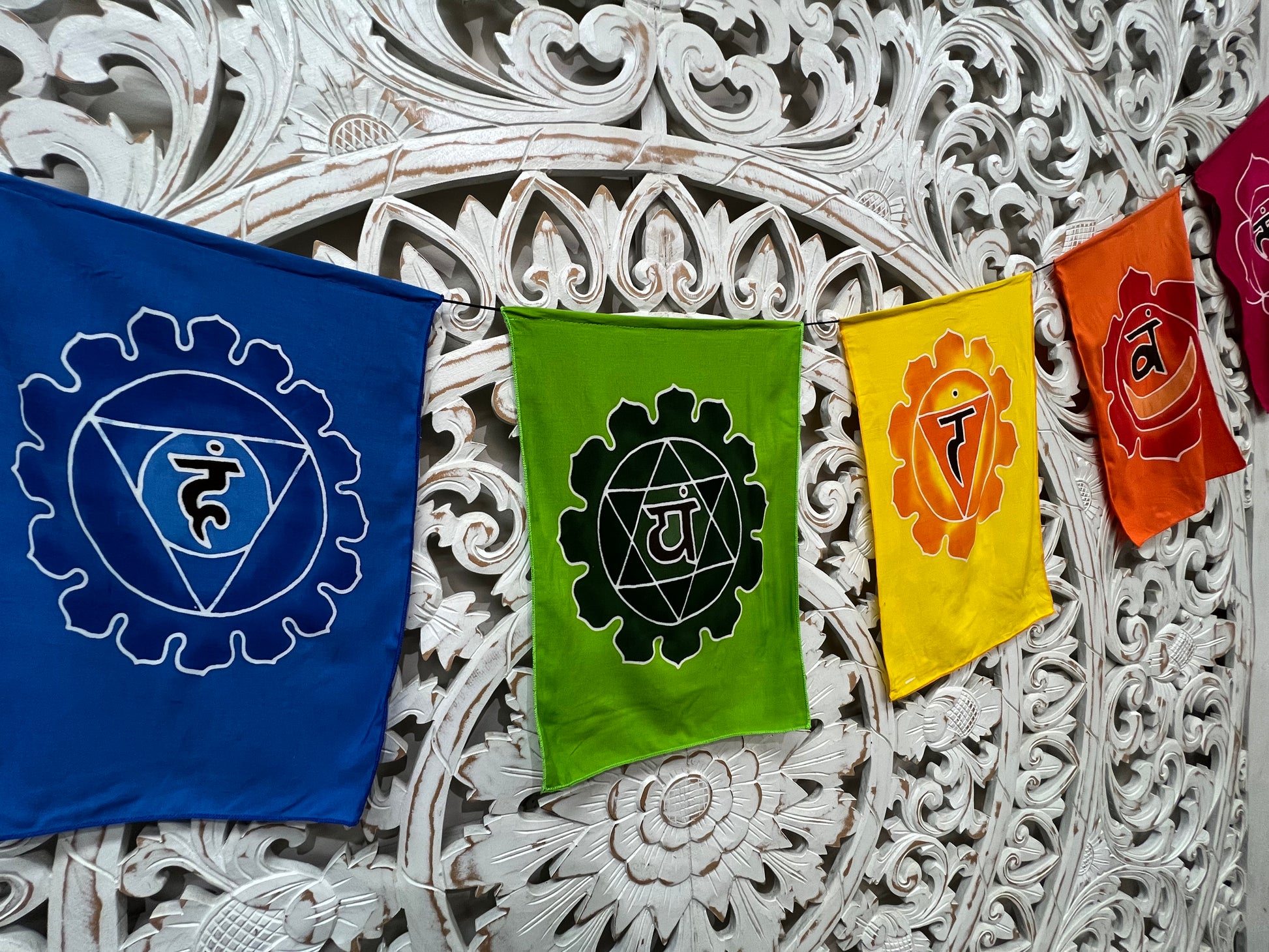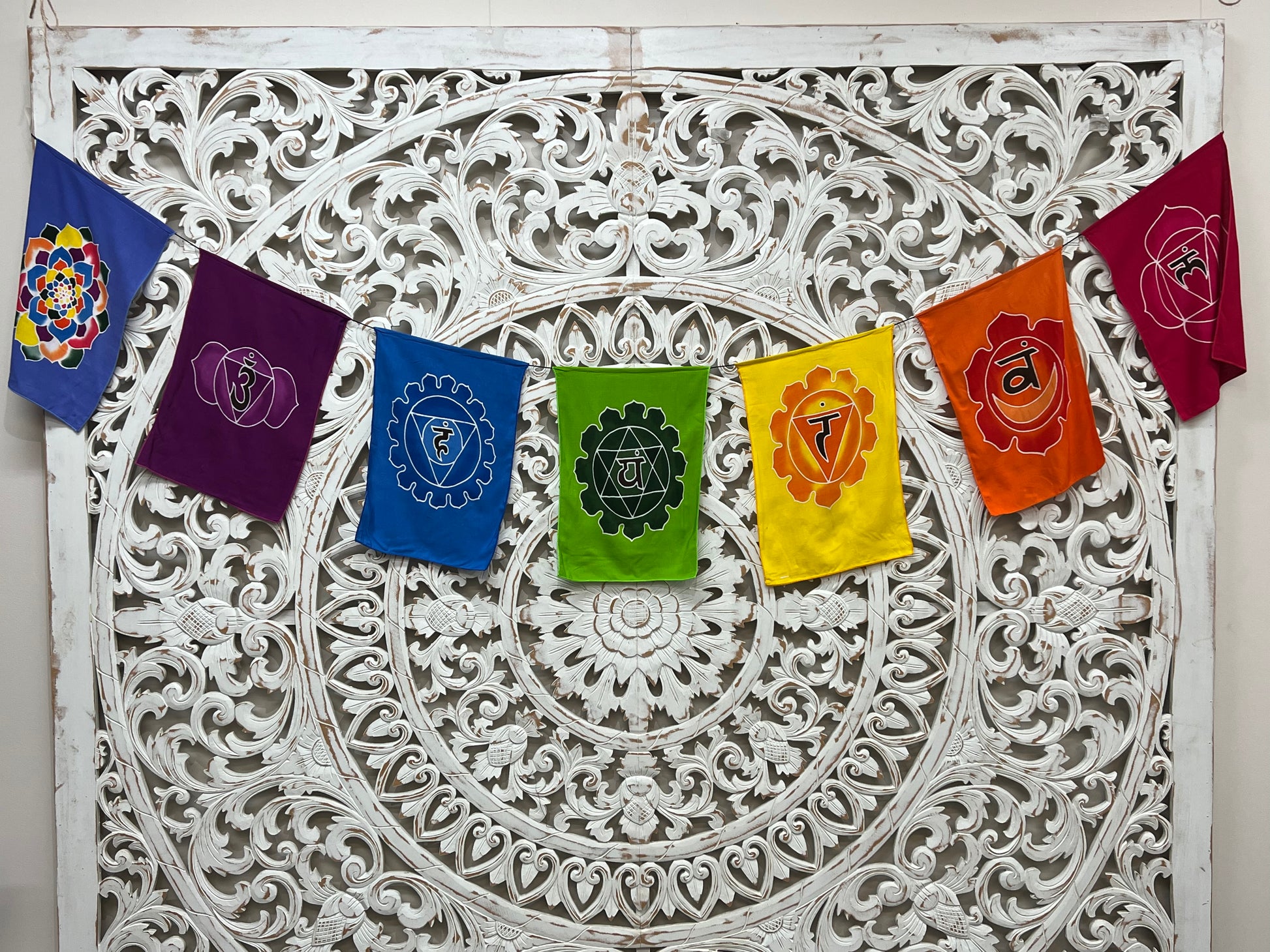 Hand Batiked Chakra Symbol Prayer Flags.