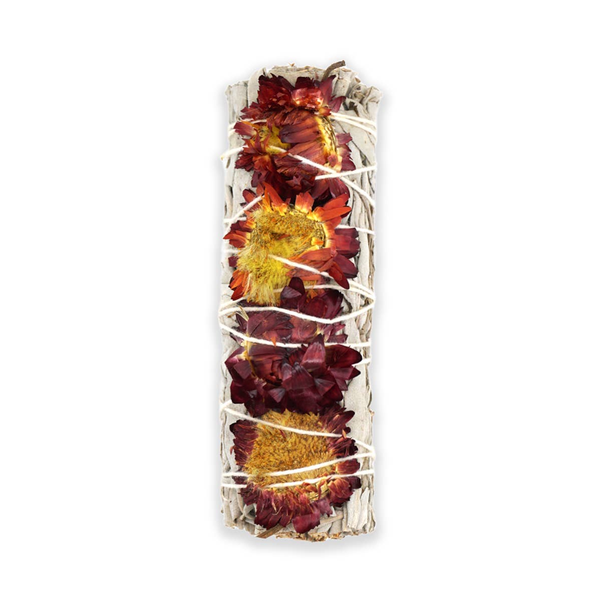 Premium quality hand-harvested and hand-tied California white sage bundles/smudge sticks with organic Red Sunflowers (4 inch).