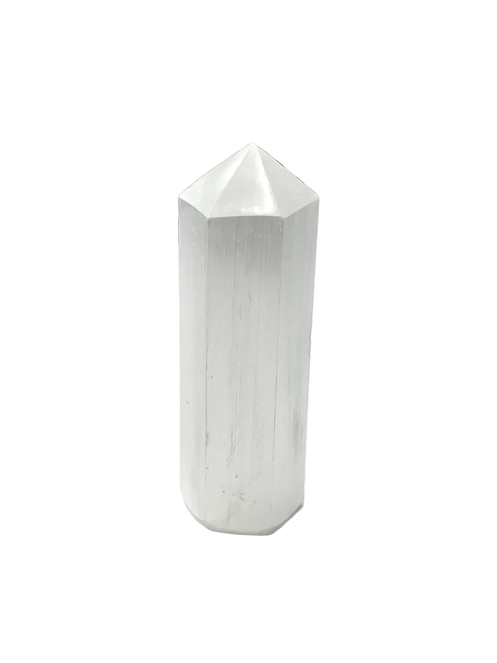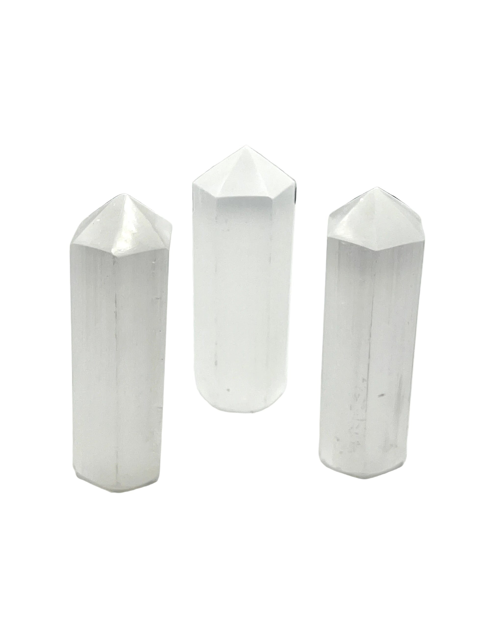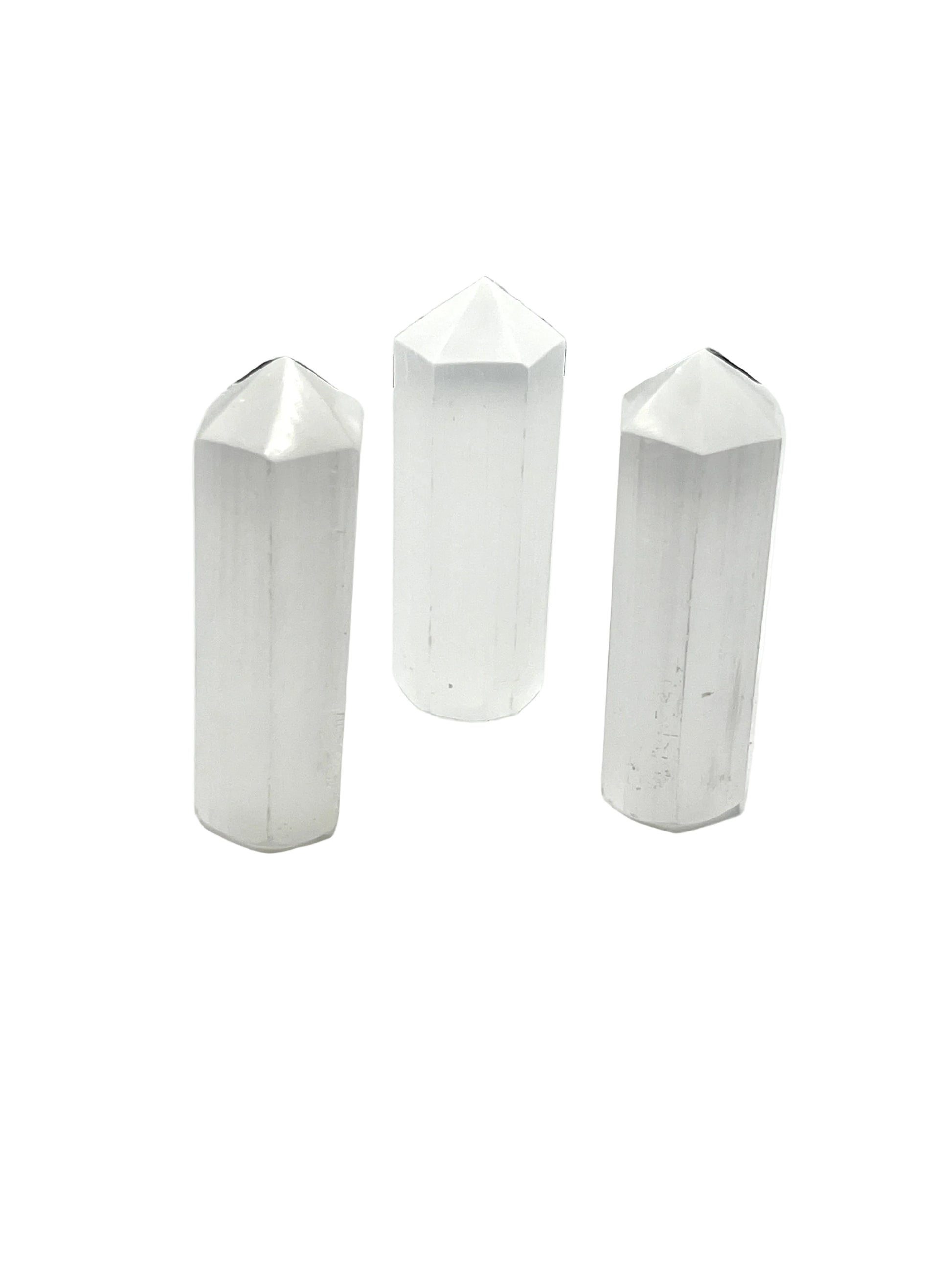 Selenite is a crystallized form of gypsum. The name Selenite comes from the Greek word for moon and means moon glow," and these Selenite pieces do glow with a shimmery, pearl-like luster. The powerful vibration of Selenite opens the Crown and Higher Chakras and is excellent for meditation or spiritual work.